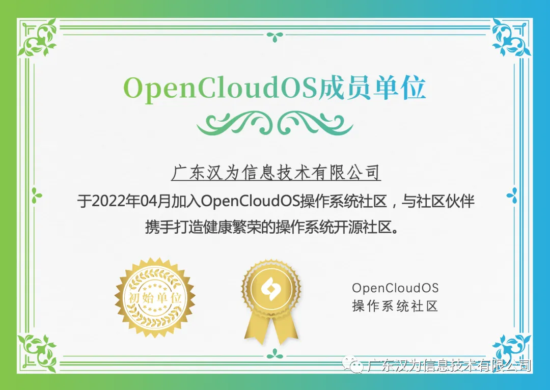2021 年 12 月 22 日,OpenCloudOS 操作系统开源社区正式成立,由操作系统及软硬件厂商与个人开发者共同倡议发起。该社区致力于研发国产化、自主可控的下一代云原生操作系统 OpenCloudOS,以打造稳定可靠、经过生产验证的操作系统发行版为特色,并以社区为依托,建设操作系统开源生态。广东汉为信息技术有限公司作为初始会员加入了OpenCloudOS社区。